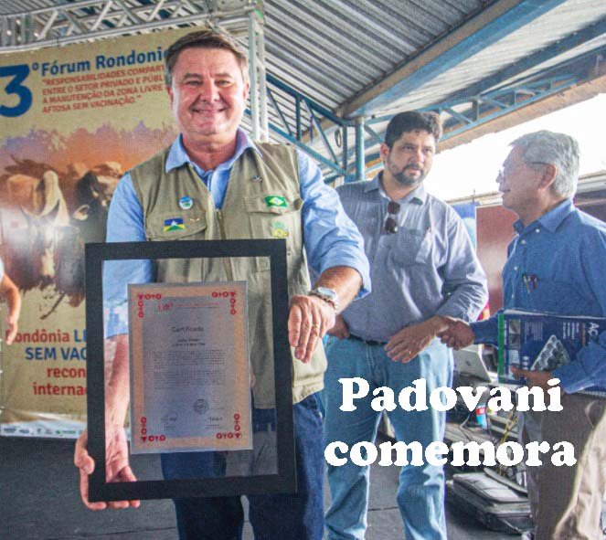 Havia, no último sábado em Ji-Paraná, durante encontro da Idaron com pecuaristas, um personagem que não cabia dentro de si de alegria. Há 10 anos comandando a Secretaria de Agricultura do Estado, o empresário Evandro Padovani não conseguia conter a emoção ao receber o Certificado de Estado Livre de Aftosa sem Vacinação, o que coloca Rondônia entre os três primeiros Estados com tal certificação, ao lado de regiões cuja agropecuária e o agronegócio tem uma História muito mais longa que a nossa (Rio Grande do Sul e Paraná. Com exclusividade para a coluna, Padovani resumiu a batalha até que se chegasse a esse imenso negócio para nossa pecuária e para nossos negócios de venda de carne para o exterior. “Rondônia, há mais de 20 anos, vem trabalhando fortemente no combate à aftosa. Nós tivemos dois momentos: em 2003, fomos reconhecidos nacionalmente como Estado livre da aftosa, mas com vacinação. Depois, continuamos a caminhada, numa parceria muito grande entre os pecuaristas, os técnicos da Idaron. Secretaria Estadual da Agricultura, até que em 2017 fomos convidados pra, em Brasília, conhecermos o Plano Nacional de Erradicação da Aftosa no Brasil”.