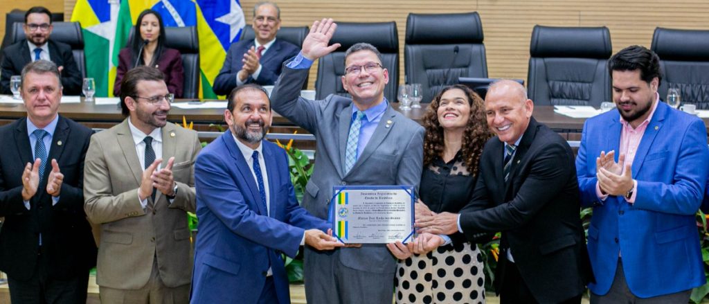 Foi uma longa, emocionante e emocionada solenidade, a registrada na tarde da segunda-feira, na Assembleia Legislativa. O governador Marcos Rocha foi homenageado com o título de Cidadão Honorário de Rondônia, num evento recheado de autoridades e onde a figura central, ao falar, fez agradecimentos sem fim, num pronunciamento que bateu em cerca de duas horas. A honraria foi proposta pelo deputado Laerte Gomes, em 2019 e entregue agora. O título de Cidadão Honorário do Estado de Rondônia é a maior honraria que o Estado pode prestar a um cidadão que não nasceu em solo rondoniense e passa a ser um cidadão pela sua história de trabalho e serviços prestados em defesa do povo da localidade que lhe concedeu tal cidadania.
